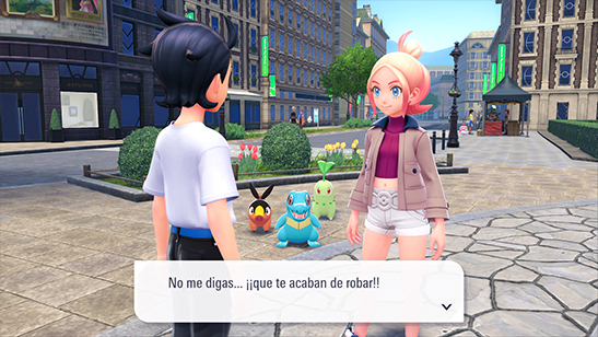 Pancham ha huido por la calle de enfrente. Chikorita, Tepig y Totodile le siguen el rastro, así que debes ir tras ellos. Tras cruzar unas pocas calles, ves que realmente Pancham está con dos Entrenadores llamados Ainara y Andre.