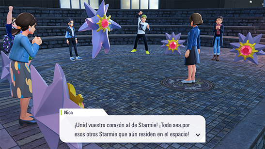 Debes capturar un Starmie (o un Staryu y evolucionarlo) y ańadirlo a tu equipo para enseńárselo a Nica. Debes hacerlo de noche, cuando se reúne la congregación de Entrenadores de Starmie.