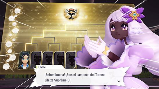 Tras derrotarla en combate, Lilette cura a tus Pokémon y te pregunta si quieres continuar con los combates del torneo. Debes derrotarla hasta 4 veces para ser campeón del Torneo Lilette Supręme D.