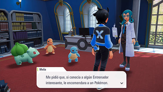 Ve al Laboratorio Pokémon junto a la Zona Salvaje 1 y sube a la segunda planta para hablar con Melia. Verás que hay 3 Pokémon esperando en su despacho.
