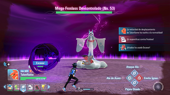 Cuando el medidor de megapoder esté lleno, pulsa R para megaevolucionar a tu Pokémon y que sus ataques hagan mucho más dańo a Mega Froslass. Sin embargo, no puede permanecer mucho tiempo en esta forma, por lo que debes volver a cargar megapoder y megaevolucionar a tus Pokémon varias veces durante el combate para derrotar a Mega Froslass.