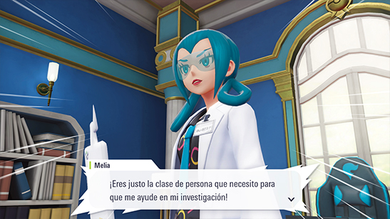 La subdirectora del laboratorio se llama Melia, y está buscando colaboradores que se ocupen de registrar Pokémon en la Pokédex para ayudarla en su investigación. Melia activa las Tareas de Melia en el menú de jugador, y por haber cumplido tu primera tarea obtienes la MT Golpe Roca.