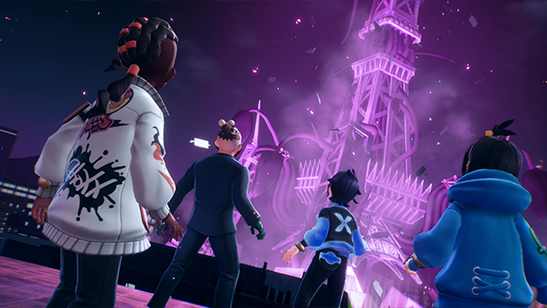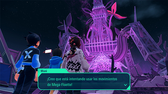 En el rellano te encuentras con el resto del Equipo MZ y cogéis el ascensor para subir a la azotea. Allí se encuentra A.Z. con Floette Flor Eterna mirando a la Torre Prisma. La torre, Ange, está a punto de perder el control.