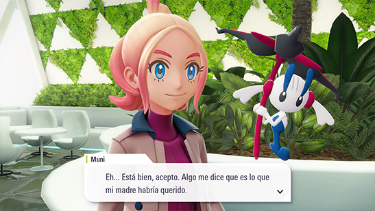 La candidata a presidenta es Muni. Muni acepta: es lo que su madre habría querido. Como ya no va a tener tiempo para combates de Pokémon, Muni decide pedirle a Floette Flor Eterna que se quede contigo, y te entrega la Floettita.