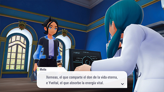 Melia te cuenta que en Kalos hay dos Pokémon legendarios: Xerneas, el que comparte el don de la vida eterna, e Yveltal, el que absorbe la energía vital. Sabe bastante de ambos porque en su momento el Team quiso capturarlos.