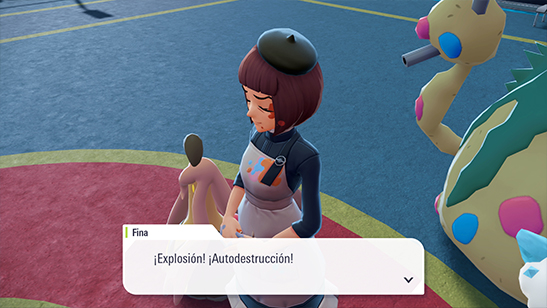 Cuando estés preparado, reta a la Artista Fina a un combate. Todos los Pokémon de Fina pueden usar Autodestrucción o Explosión por lo que conviene usar un Pokémon de tipo Fantasma o alejarse de sus Pokémon cuando vayan a explotar.