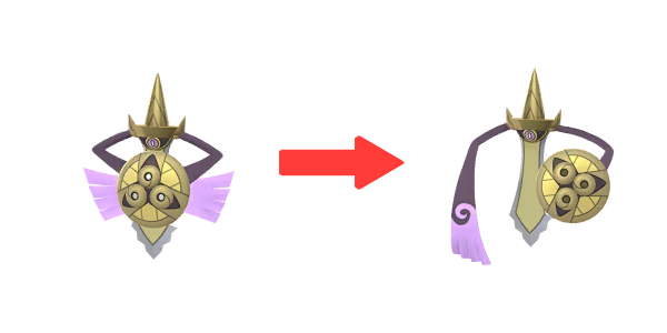 - Reversión: Puedes devolver a Aegislash Forma Filo de vuelta a su Forma Escudo usando un Escudo Protector en combate. Fuera de combate siempre se encuentra en su Forma Escudo.