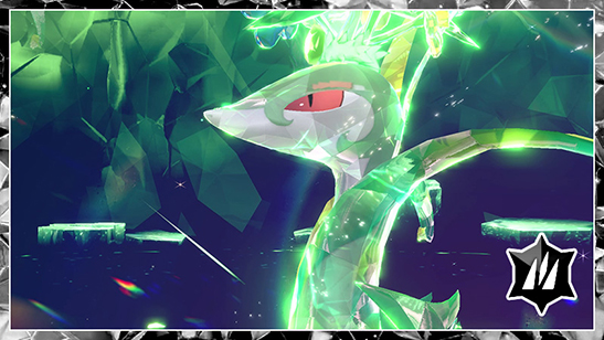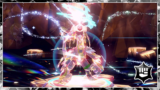 Bramaluna con teratipo Dragón (Pokémon Escarlata) o Ferropaladín con teratipo Hada (Pokémon Púrpura) aparecen con el Emblema Imbatibilidad.