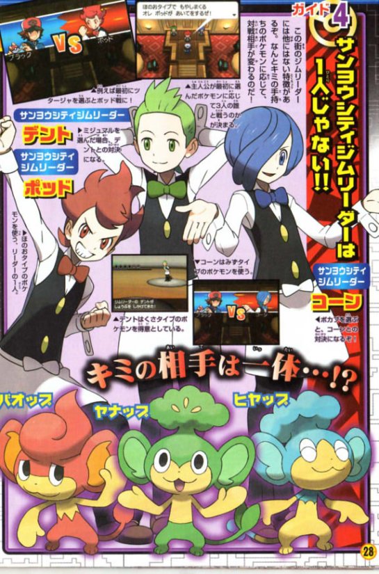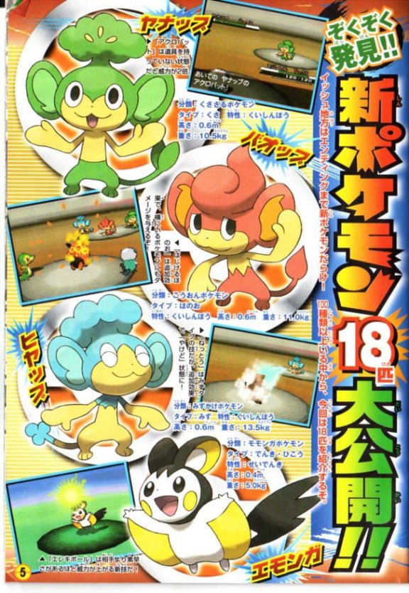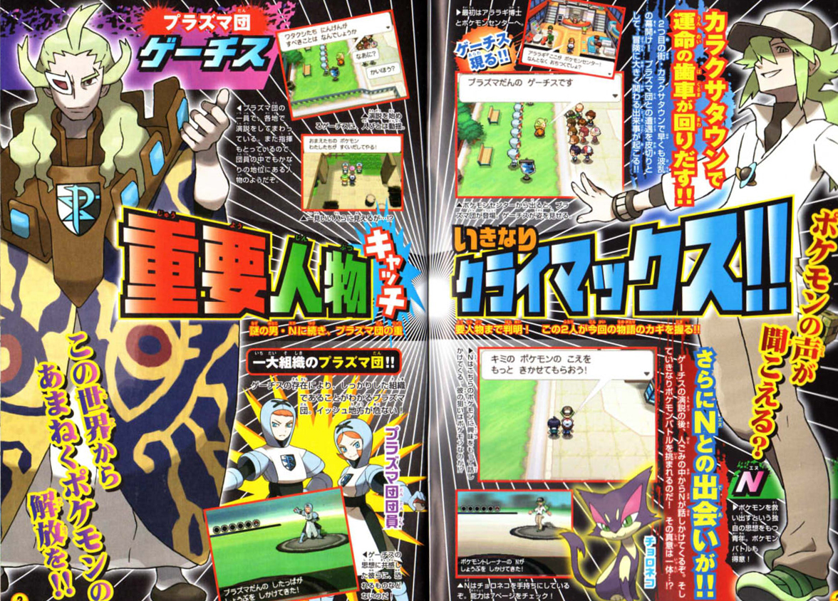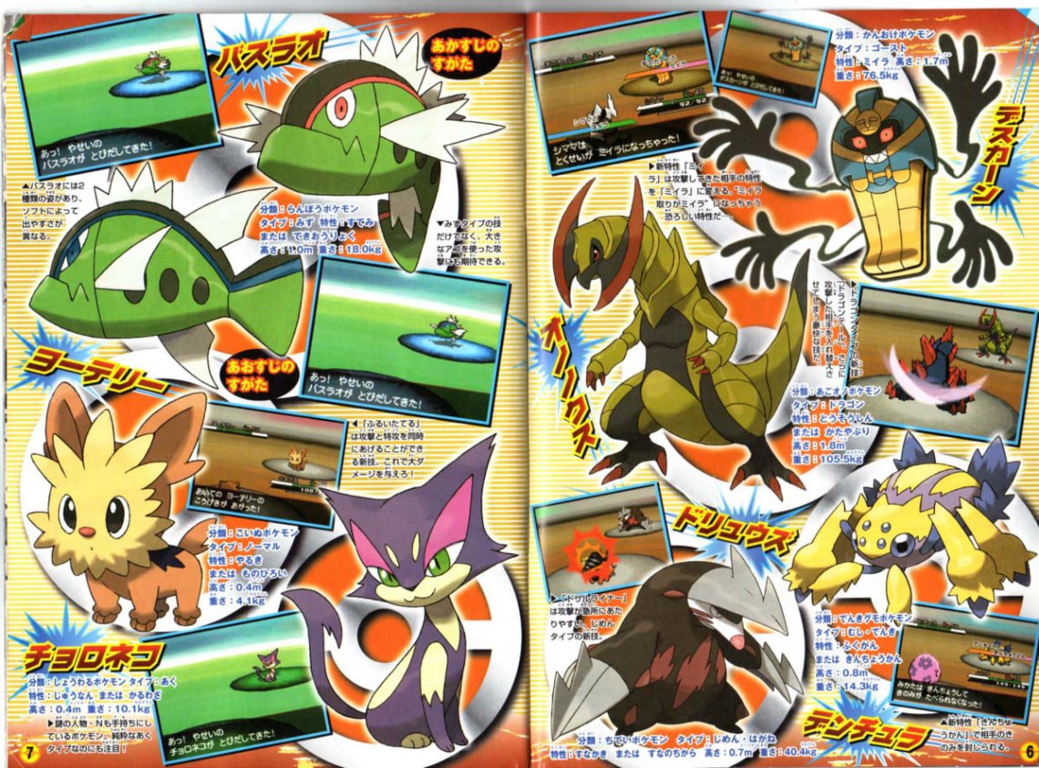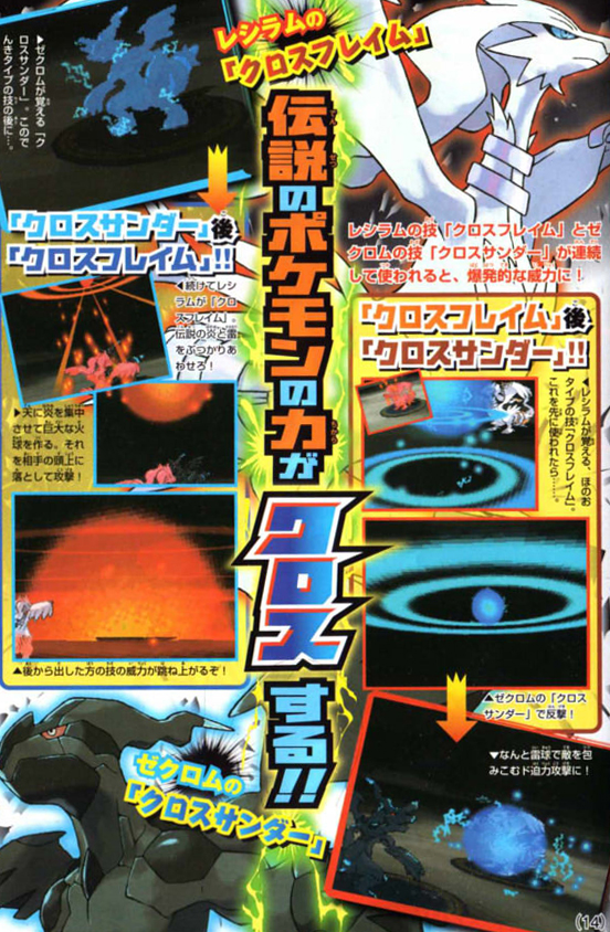 - En uno de los scans podemos ver a Reshiram y Zekrom, los cuales tienen unos movimientos exclusivos llamados Cruce Llama y Cruce Trueno respectivamente, ataques que incrementan su poder si se utilizan uno detrás de otro.