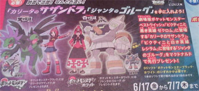 En Internet ha aparecido un nuevo scan que nos informa acerca de dos nuevos Pokémon de evento en Japón. Se trata de un Hydreigon shiny y de un Golurk shiny que estarán disponibles en las Ediciones Negra y Blanca respectivamente.- El Hydreigon shiny se basa en el Hydreigon de Carlita en Victini y el Héroe Negro: Zekrom. Sólo en la Edición Negra.