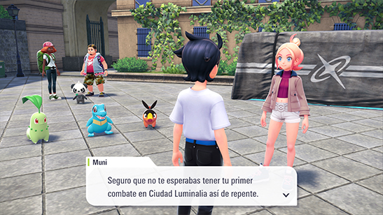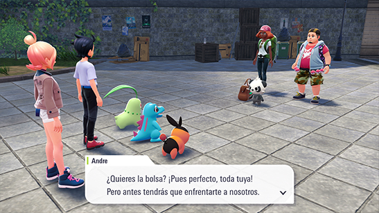 Pancham ha huido por la calle de enfrente. Chikorita, Tepig y Totodile le siguen el rastro, así que debes ir tras ellos. Tras cruzar unas pocas calles, ves que realmente Pancham está con dos Entrenadores llamados Ainara y Andre.