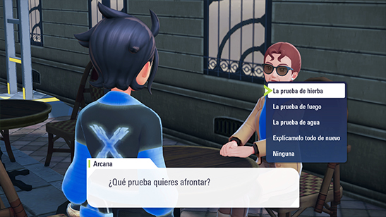 Cuando estés preparado, reta a la Entrenadora Arcana a un combate. Arcana te explica en qué consiste cada prueba:
