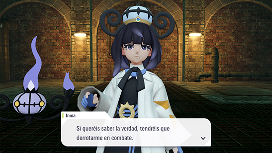 Al final de las alcantarillas se encuentra Inma con su Chandelure. Matičre deduce que no era un secuestro: se encuentra allí porque quiere. Para conocer la verdad, Inma te reta a un combate contra sus Pokémon. Matičre cura a tu equipo antes.