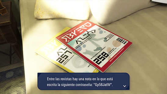 Sobre la cama hay unas revistas, entre las cuales se encuentra una nota con la contraseńa Gp58JatW. En ese momento te llama Muni de nuevo para preguntarte la contraseńa. Tras recordársela, lo comprueba y te agradece el favor antes de entrar a una reunión.