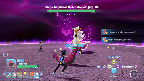 Cuando el medidor de megapoder esté lleno, pulsa R para megaevolucionar a tu Pokémon y que sus ataques hagan mucho más dańo a Mega Ampharos. Sin embargo, no puede permanecer mucho tiempo en esta forma, por lo que debes volver a cargar megapoder y megaevolucionar a tus Pokémon varias veces durante el combate para derrotar a Mega Ampharos.
