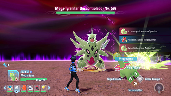 Cuando el medidor de megapoder esté lleno, pulsa R para megaevolucionar a tu Pokémon y que sus ataques hagan mucho más dańo a Mega Tyranitar. Sin embargo, no puede permanecer mucho tiempo en esta forma, por lo que debes volver a cargar megapoder y megaevolucionar a tus Pokémon varias veces durante el combate para derrotar a Mega Tyranitar.