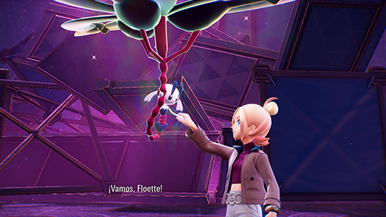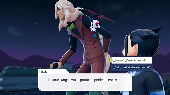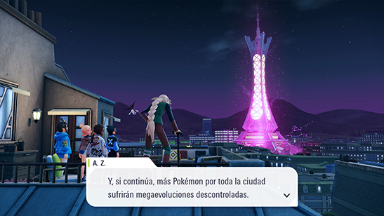 En el rellano te encuentras con el resto del Equipo MZ y cogéis el ascensor para subir a la azotea. Allí se encuentra A.Z. con Floette Flor Eterna mirando a la Torre Prisma. La torre, Ange, está a punto de perder el control.
