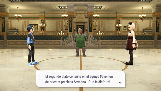 El tercero de los combates tiene lugar contra la Gastrónoma Severina, que usa los siguientes Pokémon, todos ellos con el objeto Pluma Feérica equipado: