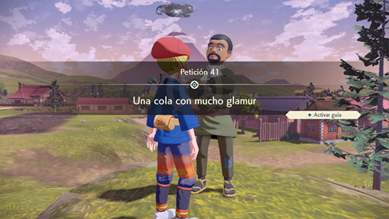 1. Muéstrale un Pokémon con una glamurosa cola en espiral a Michi, uno de los aldeanos. (Glameow)