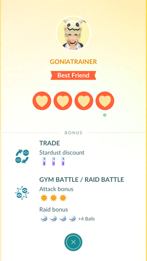 - En Línea: Desde julio de 2020 puedes ver cuáles de tus amigos están conectados (online) en Pokémon GO, para poder así interactuar con ellos en Incursiones o Combates. Además se integra con Niantic Social, de manera que puedes ver a qué otros juegos de Niantic juegan tus amigos.