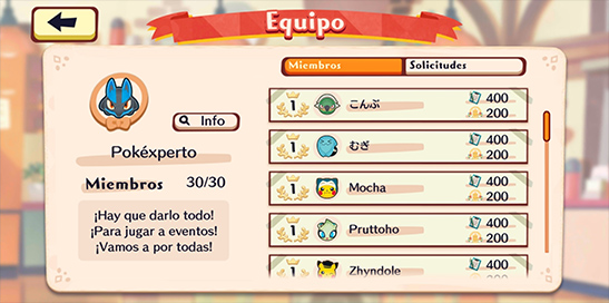 Utilidad del Equipo: La finalidad de los equipos en Pokémon Café Mix es conseguir Energía adicional de otros miembros (hasta 5 energías cada 24 horas). En Pokémon Café Mix permitía participar en eventos de Comandas Grupales.