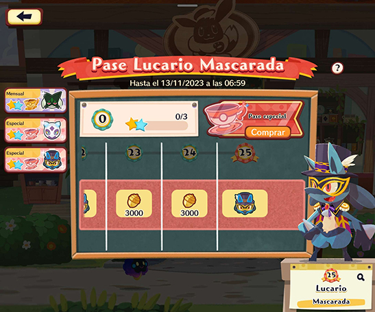 Los premios de este pase son Lucario Mascarada y 30.000 Bellotas.