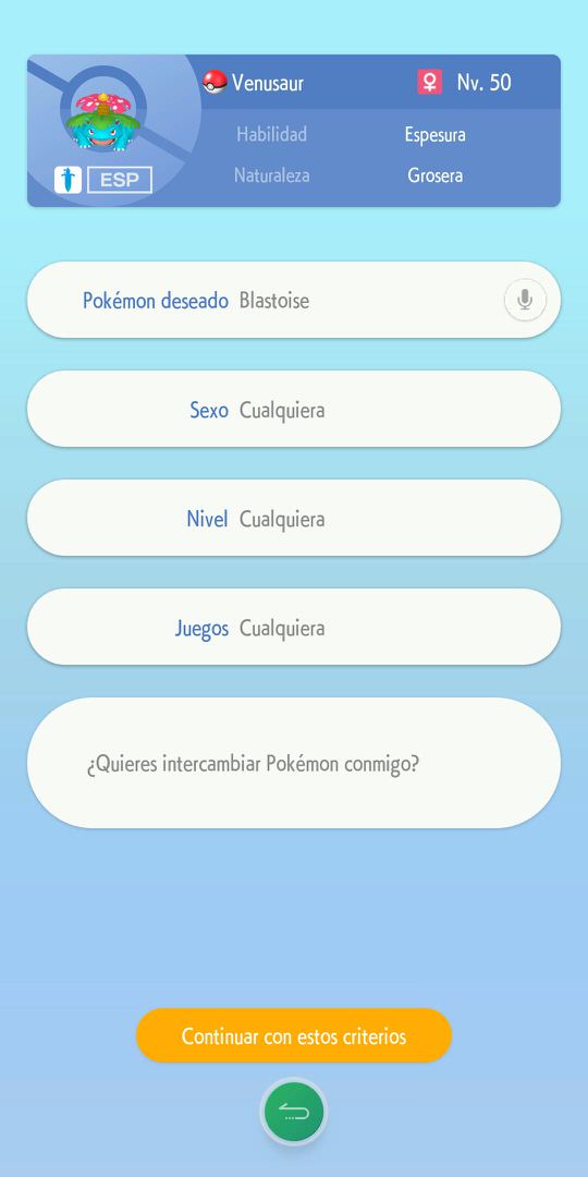 » En ocasiones, si hay demasiados resultados de una determinada búsqueda de un Pokémon, es aconsejable ańadir más criterios de búsqueda (por ejemplo, nivel) para poder acceder a todos los resultados de ese Pokémon.
