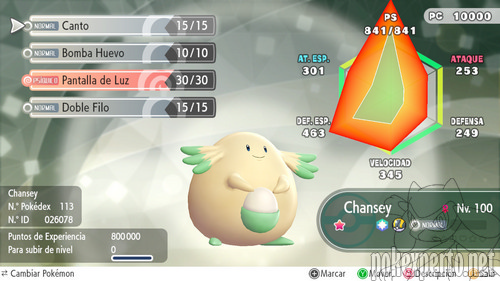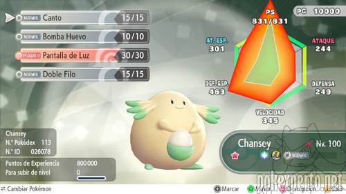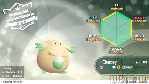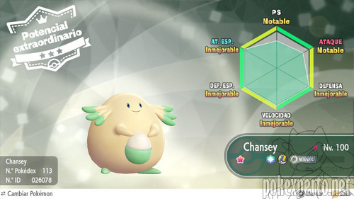 Tomando el ejemplo de un Chansey shiny capturado durante una Racha de Capturas del Pokémon, podemos apreciar que tiene dos estadísticas que no están al máximo: