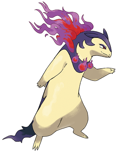 Typhlosion de Hisui tiene una actitud calmada que se ve en sus movimientos gráciles y refinados. A veces mira al vacío y se cree que está observando el movimiento de la energía vital y los espíritus errantes que devora. Se cree que las llamas del Pokémon purifican estos espíritus y los mandan de vuelta al lugar al que pertenecen.