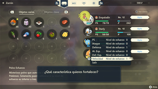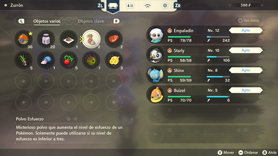 - Objetos: Los GV se pueden mejorar con determinados Objetos de Entrenamiento, que solo se pueden usar en Pokémon con el nivel de GV adecuado.