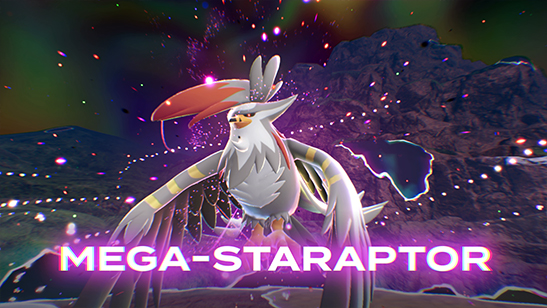 Mega Staraptor usa Onda Certera para lanzar una bola de energía que golpea a Pokémon a distancia, así como Ala Bis para golpear a Pokémon cercanos con sus alas, Doble Filo para embestir hacia el frente y Ataque Ala, que carga energía para luego perseguirte por la zona con apariciones súbitas.