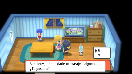 En el Mercado Marino de Ciudad Marina una chica analiza el nivel de entrenamiento del primer Pokémon de tu equipo.