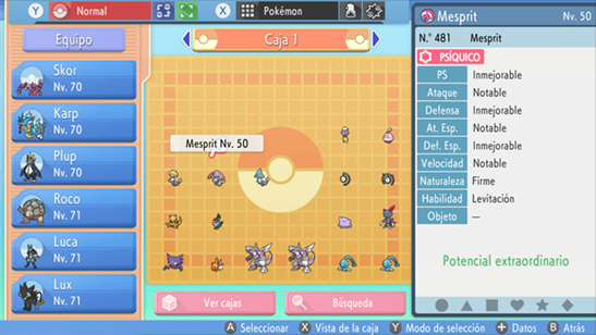 La evaluación de los Valores Individuales de tus Pokémon la puedes hacer directamente desde las Cajas del PC pulsando + en el perfil del Pokémon.
