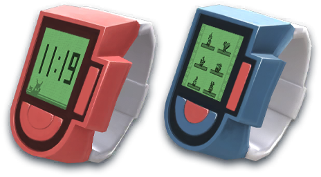 El personaje masculino tiene un Poké Reloj azul, mientras que el personaje femenino tiene un Poké Reloj rojo.
