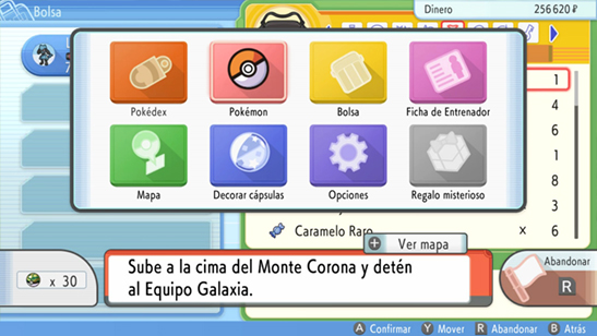 - A continuación debes pulsar 3 veces B para salir del menú de objetos. Si lo hiciste bien, verás el menú del Pokémon con el menú principal superpuesto. Si no ves algo parecido a la imagen de ejemplo, vuelve a empezar.