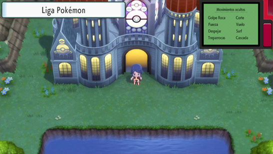 Lo más sencillo es Pulsar 1 vez Arriba, luego Mantener Derecha hasta escuchar las escaleras mecánicas, luego Pulsar Derecha para subir las escaleras de nuevo, y luego Mantener Izquierda y Abajo hasta escuchar que el personaje sale de la Liga Pokémon.