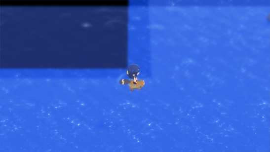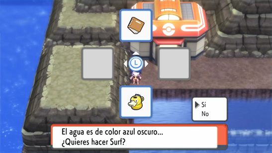 - Presiona A para surfear. Te saldrá la pregunta confirmando si quieres surfear, y en este momento debes pulsar A para confirmar al mismo tiempo que presionas Abajo justo cuando saltas al agua para usar el objeto clave asignado.