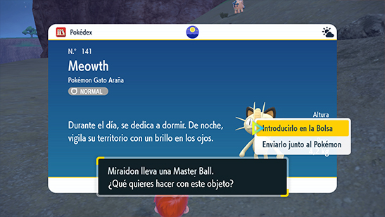 - Captura un Pokémon: Captura un Pokémon salvaje. Cuando el juego te pregunte si quieres ańadirlo al equipo (comprueba que está activado en Opciones), coloca el cursor en Koraidon o Miraidon y pulsa A y B a la vez para seleccionarlo.