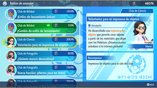 - Impresora de Objetos para la sala del club que permite crear objetos a partir de los materiales que dejan caer los Pokémon.