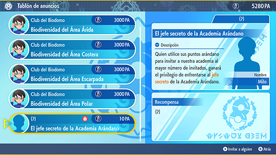 Quien utilice sus Puntos Arándano para invitar a nuestra academia al mayor número de invitados, ganará el privilegio de enfrentarse al jefe secreto de la Academia Arándano. Nombre en clave: Milo.