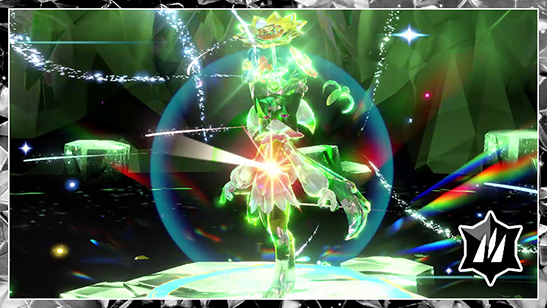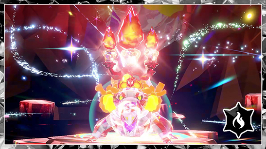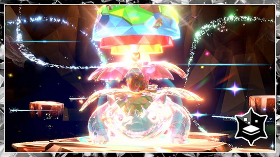 Bramaluna con teratipo Dragón (Pokémon Escarlata) o Ferropaladín con teratipo Hada (Pokémon Púrpura) aparecen con el Emblema Imbatibilidad.