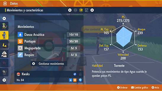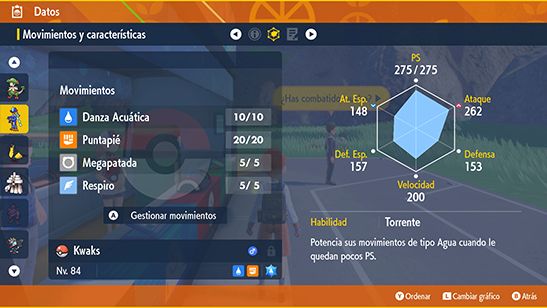 » Puedes ver el efecto de cada naturaleza en su Perfil, en la pantalla de stats. El stat con indicador rojo estará aumentado por la naturaleza, mientras que el stat con indicador azul está reducido.