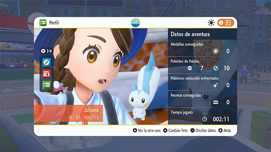 En la aplicación perfil del SmartRotom puedes elegir una foto de perfil con el atuendo, el peinado, la pose y el filtro que quieras, y aparecer con el Pokémon que camina contigo.