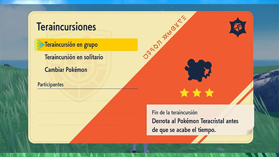 - Menú de Teraincursión: Al interactuar con el cristal puedes elegir a Pokémon de tu equipo o de tus cajas para participar en las Teraincursiones. También verás el Nivel y Pokémon de la Teraincursión.