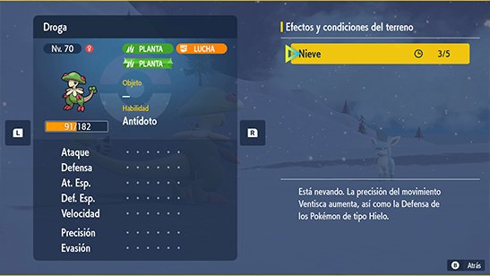 - Activación: La habilidad Nevada y los Movimientos Nuevos Paisaje Nevado y Fría Acogida provocan Nieve durante 5 turnos (8 turnos con el objeto Roca Helada).