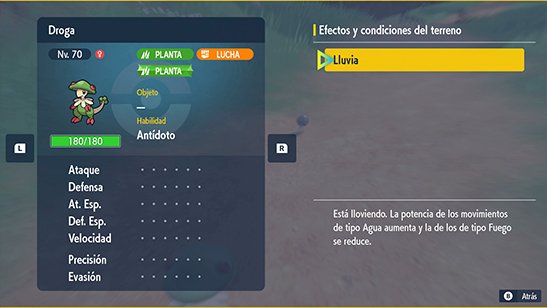 La mayoría de zonas de Paldea pueden no tener un clima activo. En esos casos los efectos adicionales mencionados abajo no se aplican.