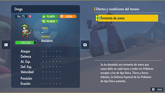 - Activación: La habilidades Chorro Arena y Expulsarena y el movimiento Tormenta de Arena provocan Tormenta de Arena durante 5 turnos (8 turnos con el objeto Roca Suave).