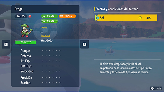- Activación: Las habilidades Sequía y Latido Oricalco y el movimiento Día Soleado provocan Sol durante 5 turnos (8 turnos con el objeto Roca Calor).