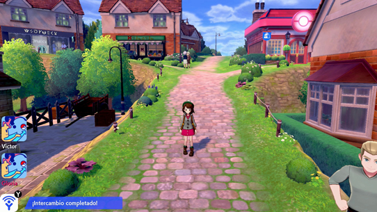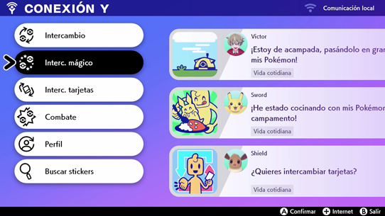 - Intercambio Mágico: Elige un Pokémon que intercambiar y sigue jugando normalmente. El Pokémon se intercambiará por otro Pokémon de otra persona vía conexión local o Nintendo Switch Online. El juego te avisará cuando el intercambio se haya completado.