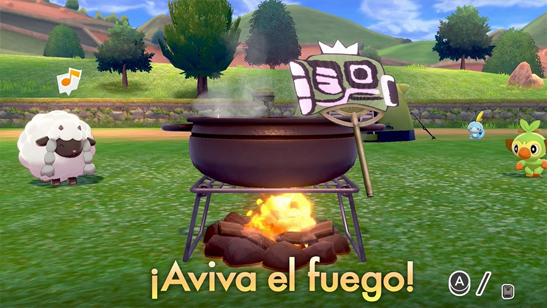 En el Poké Campamento puedes preparar curri, un plato de moda en Galar. Hay muchas formas de preparar este plato, con muchos sabores diferentes dependiendo de las bayas y otros ingredientes que eches a la olla.